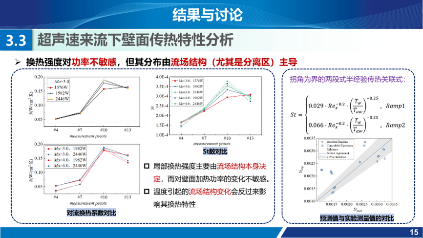 王少展在会上报告了题为《进气道压缩面壁面温度分布与换热特性研究》的研究成果。针对典型进气道两级压缩面构型,采用基于内置加热单元的流-热耦合风洞实验技术,实现高超声速飞行器减速返回阶段的热环境特征模拟。结合瞬态测量手段,探究了壁温高于来流总温工况下的壁面温度分布、传热特性和壁面热效应对分离流动的影响。基于实验数据,开发了适用于该飞行阶段的分段式半经验传热关联式,为宽速域飞行器的精细化热防护设计提供了数据支撑。